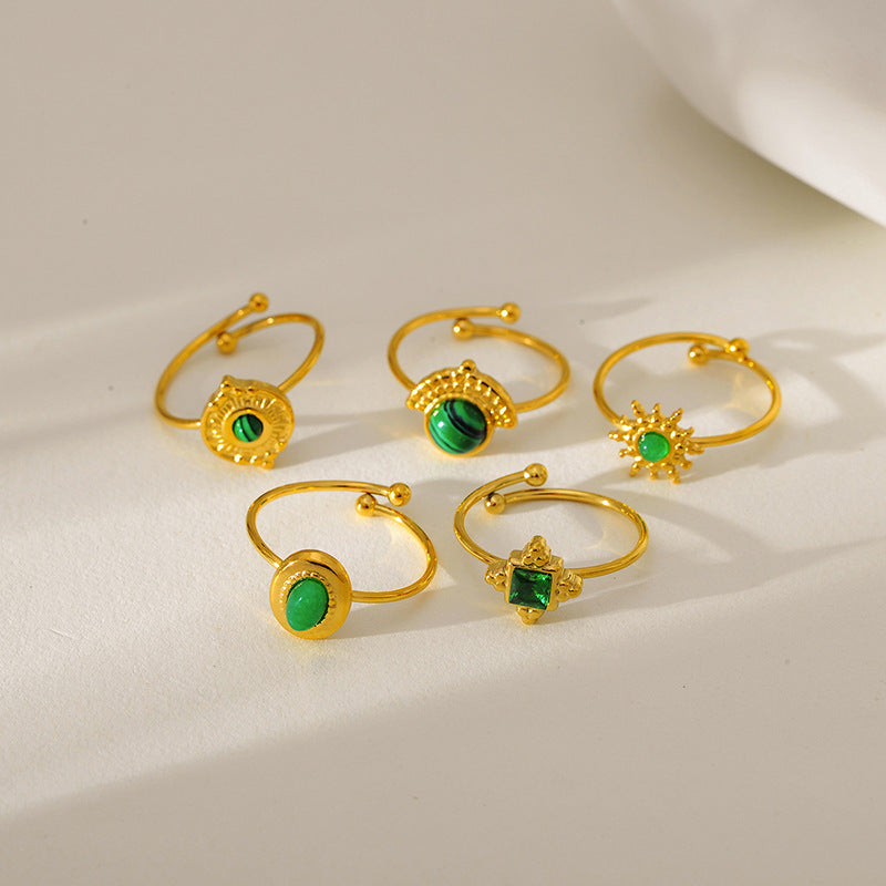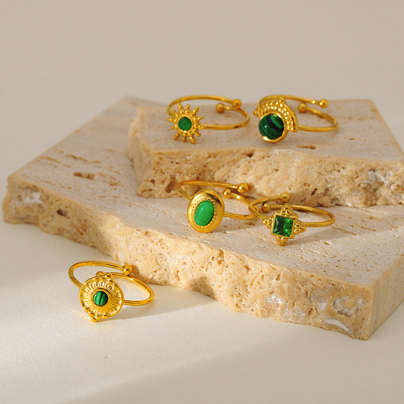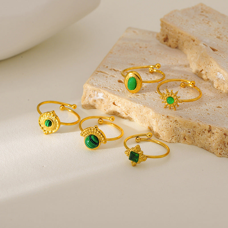 Crafted from durable 304 stainless steel and finished with a luxurious gold electroplating, this open-mouth adjustable ring is as practical as it is stylish—made to fit most sizes comfortably. Choose from various unique styles including square, round, semicircle, and even sunflower-inspired designs, all with rich green tones.