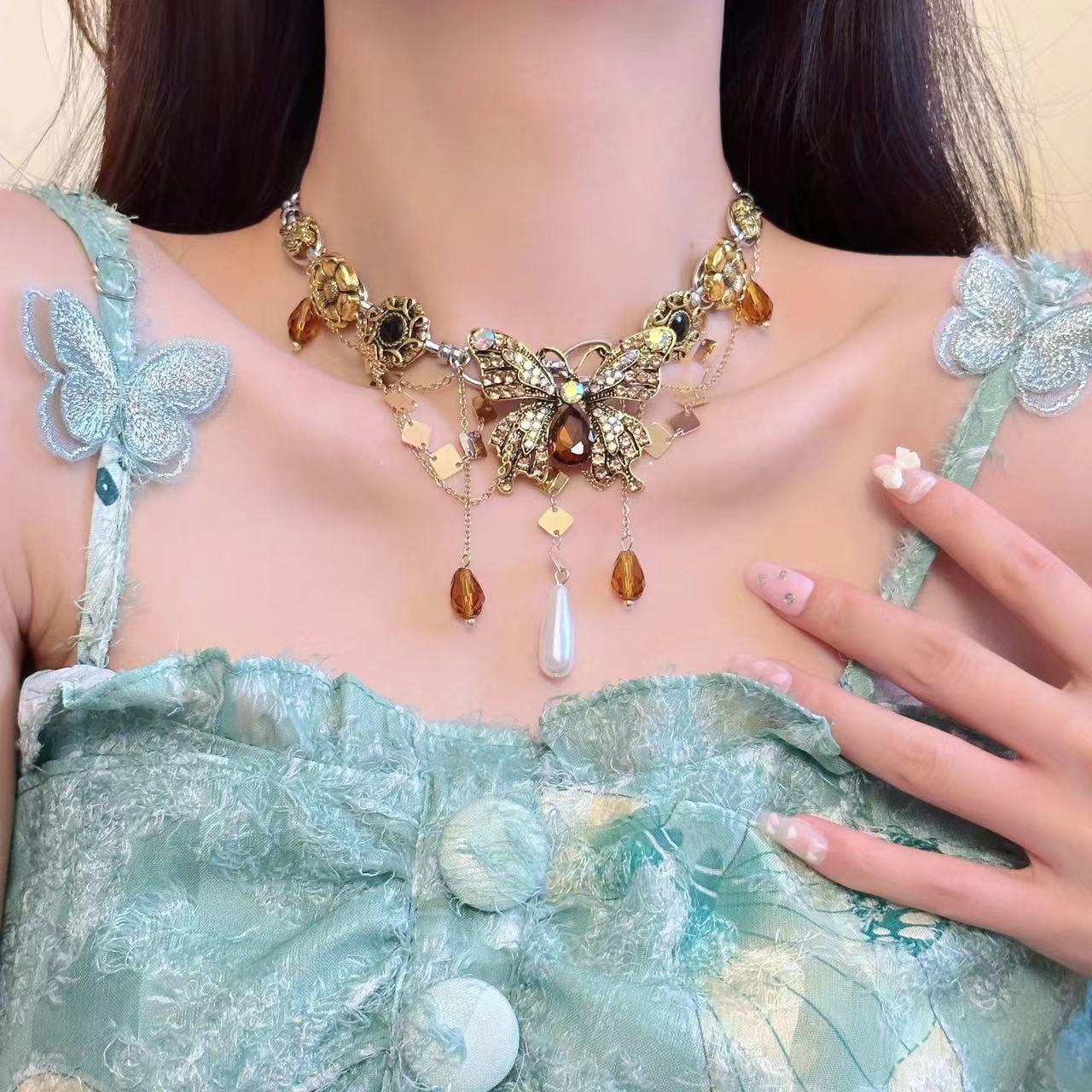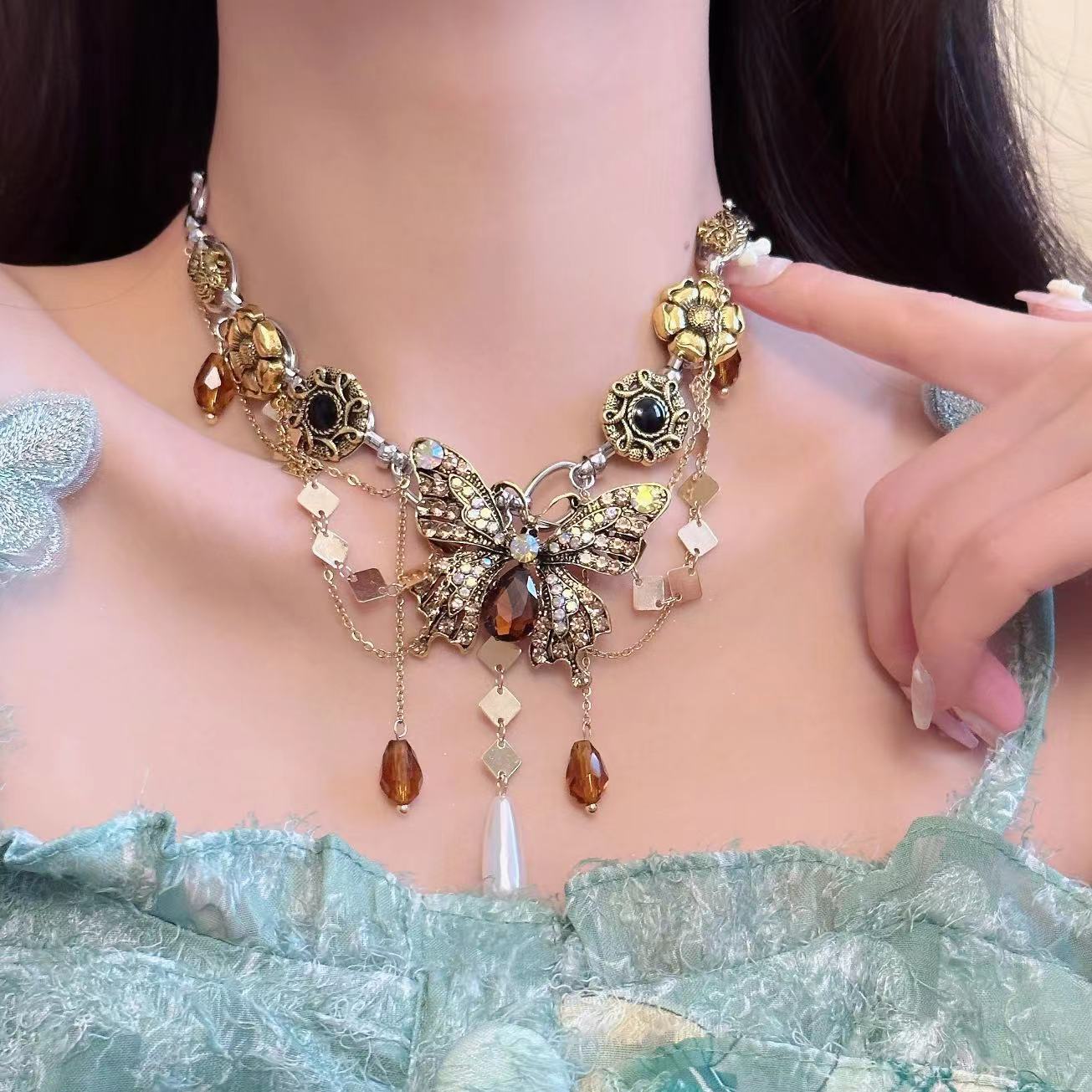 Retro Maillard Rhinestone Butterfly Pendant Necklace