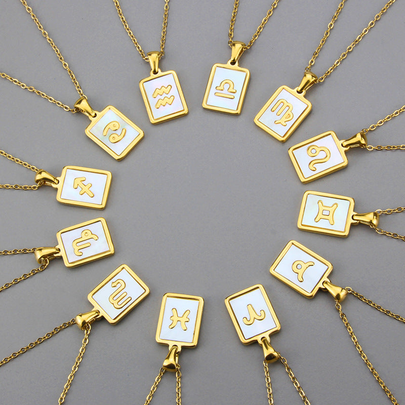 Shop the Stainless Steel Square Shell Zodiac Necklace, featuring an electroplated titanium steel pendant. With a 50cm chain, this stylish necklace makes a perfect accessory or gift for zodiac sign lovers.