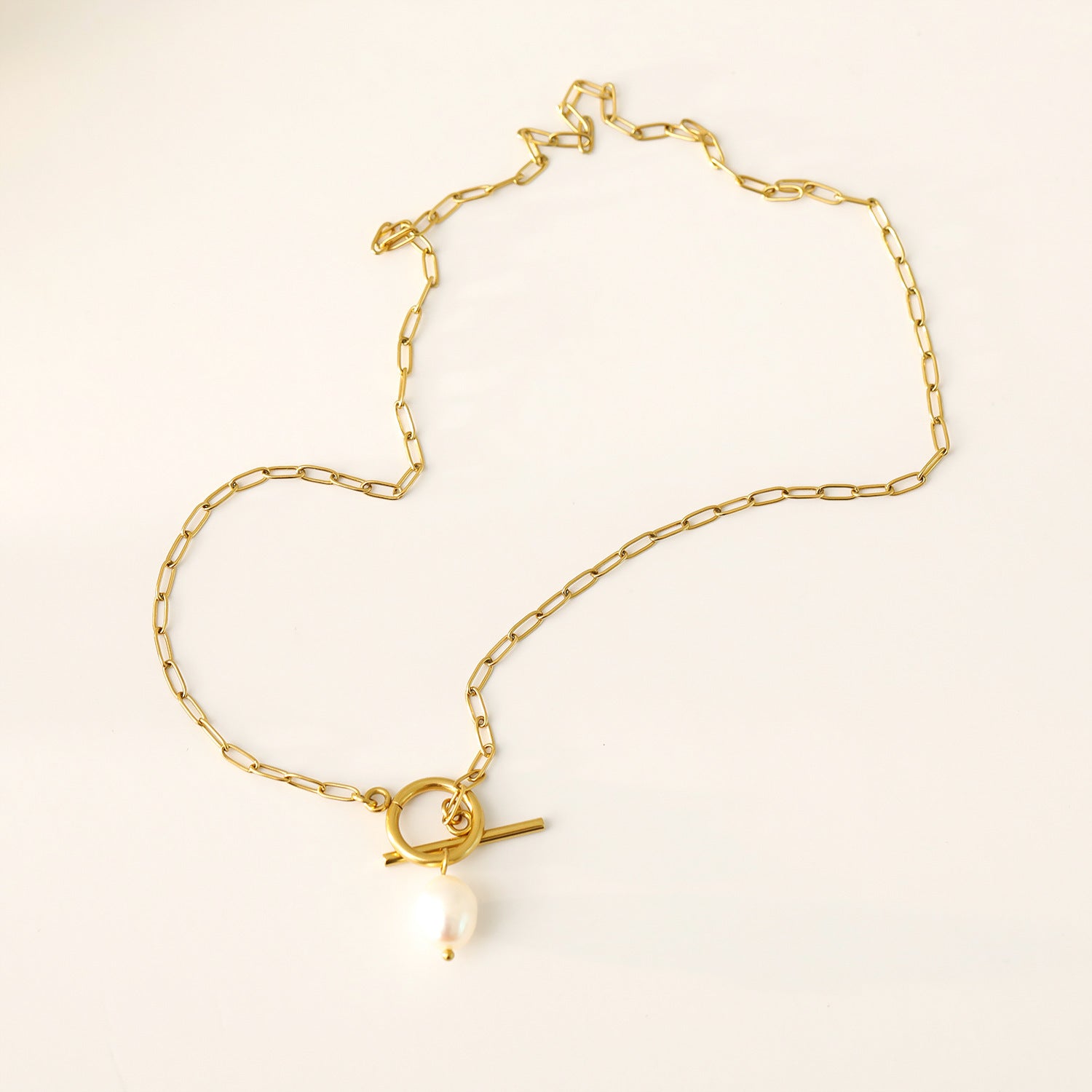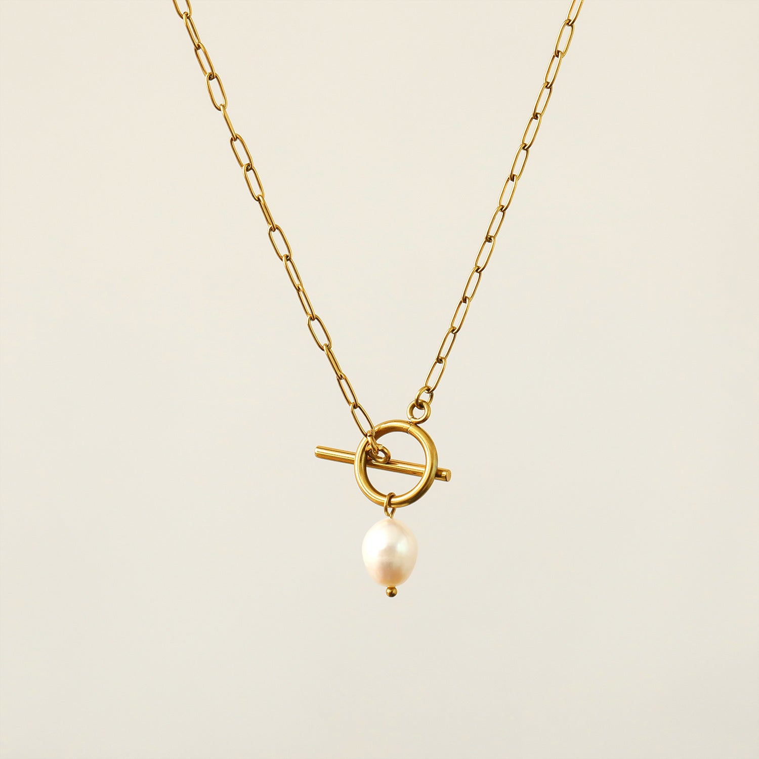 A classic 9mm baroque pearl adds natural charm to the modern shape, creating a striking balance between soft and structured. Suspended on a distinctive bamboo-style stainless steel chain, this piece brings effortless sophistication to any outfit—from casual chic to evening elegance.