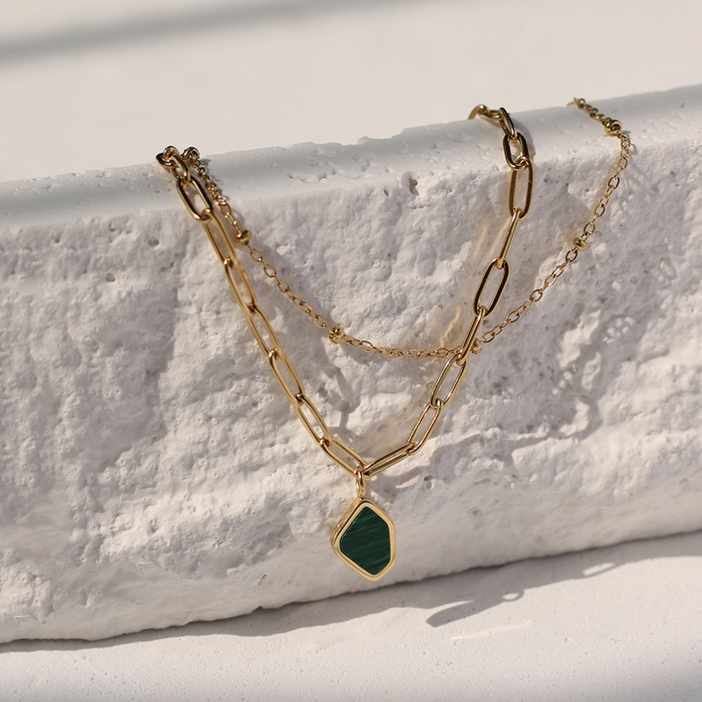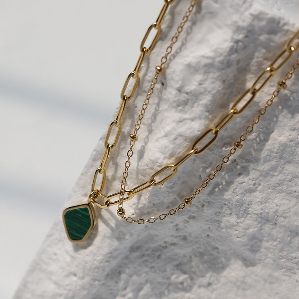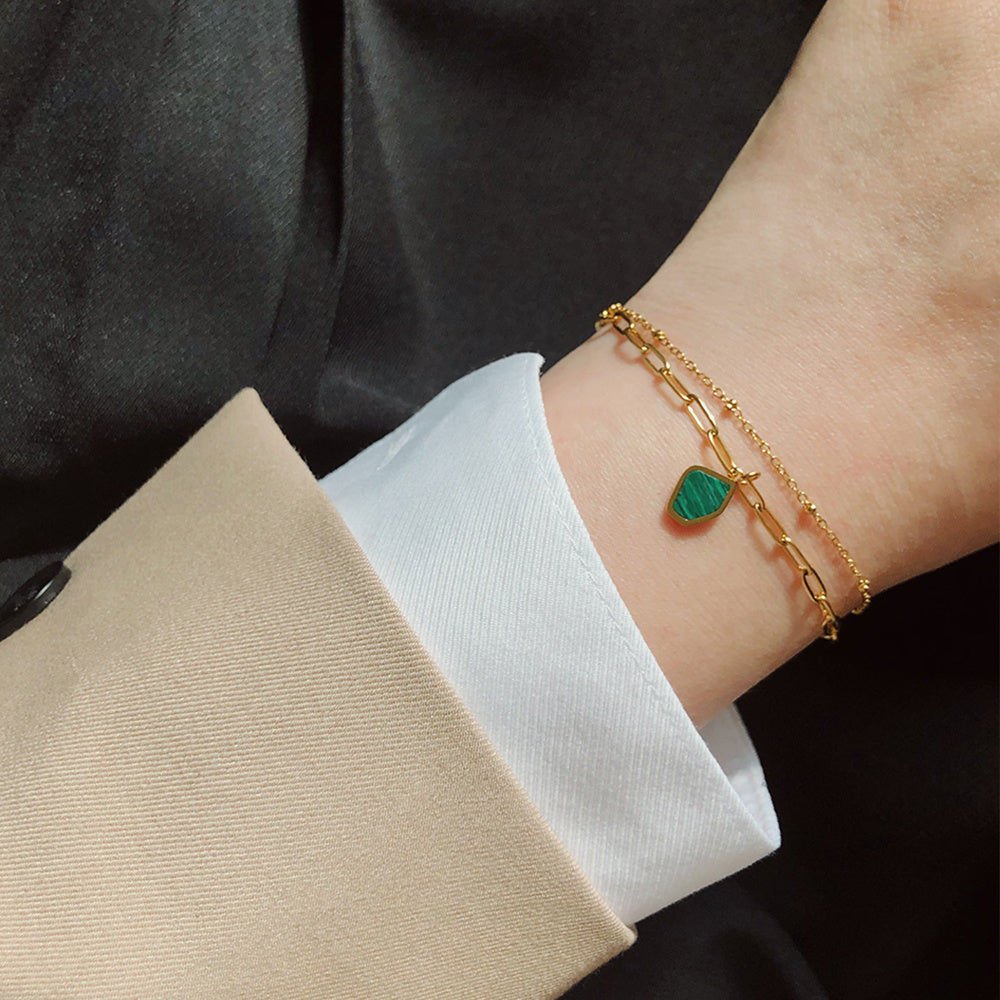 The stylish green pendant (7x9mm) features a striped, irregular geometric shape, giving the bracelet a unique and artistic appeal. Its double-layer chain design adds dimension and sophistication, while the adjustable 16+5cm chain length ensures a comfortable fit for most wrists.